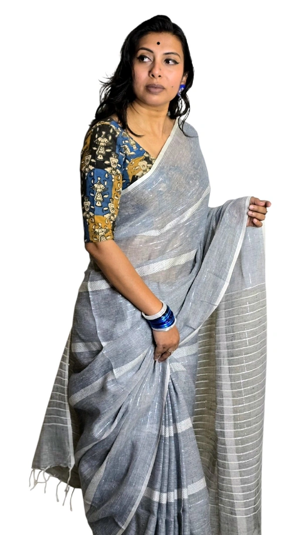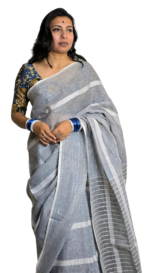 Made from premium-quality linen, this saree promises a soft and breathable experience, keeping you comfortable throughout the day. The understated grey tone exudes elegance, making it ideal for both professional and casual settings. Pair it with pearl jewellery or silver replica accessories to elevate your look effortlessly.