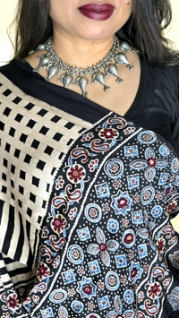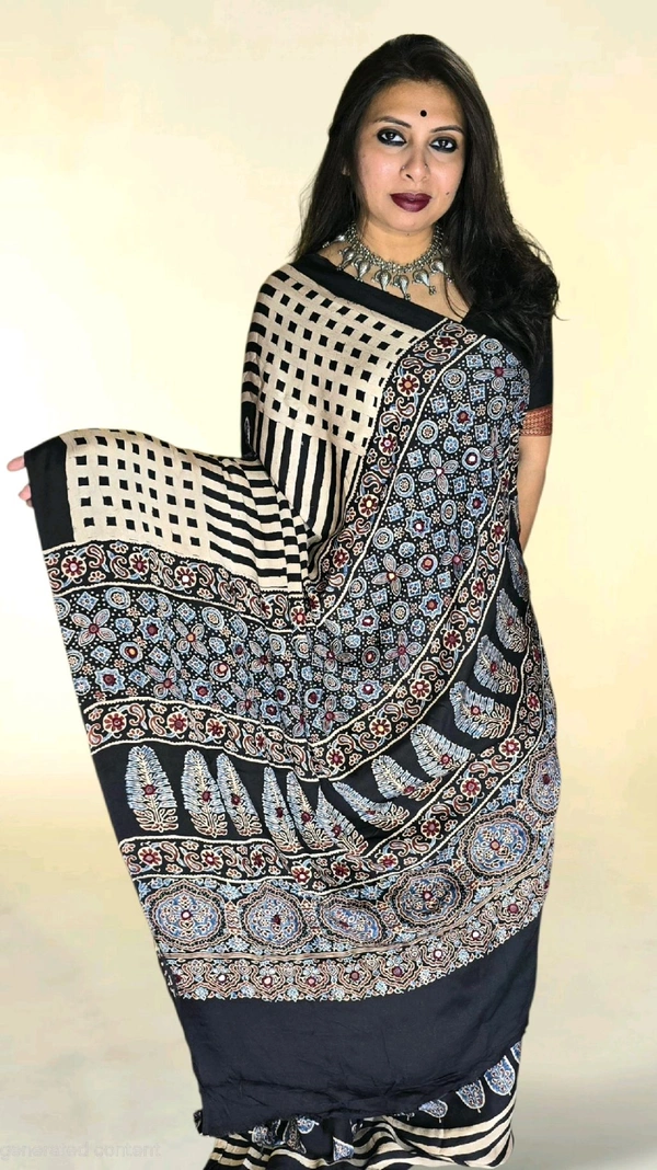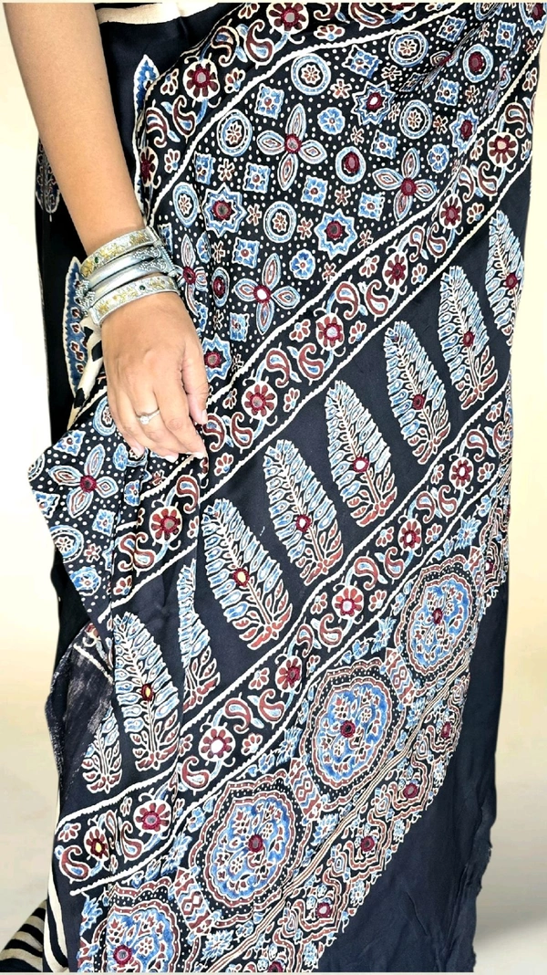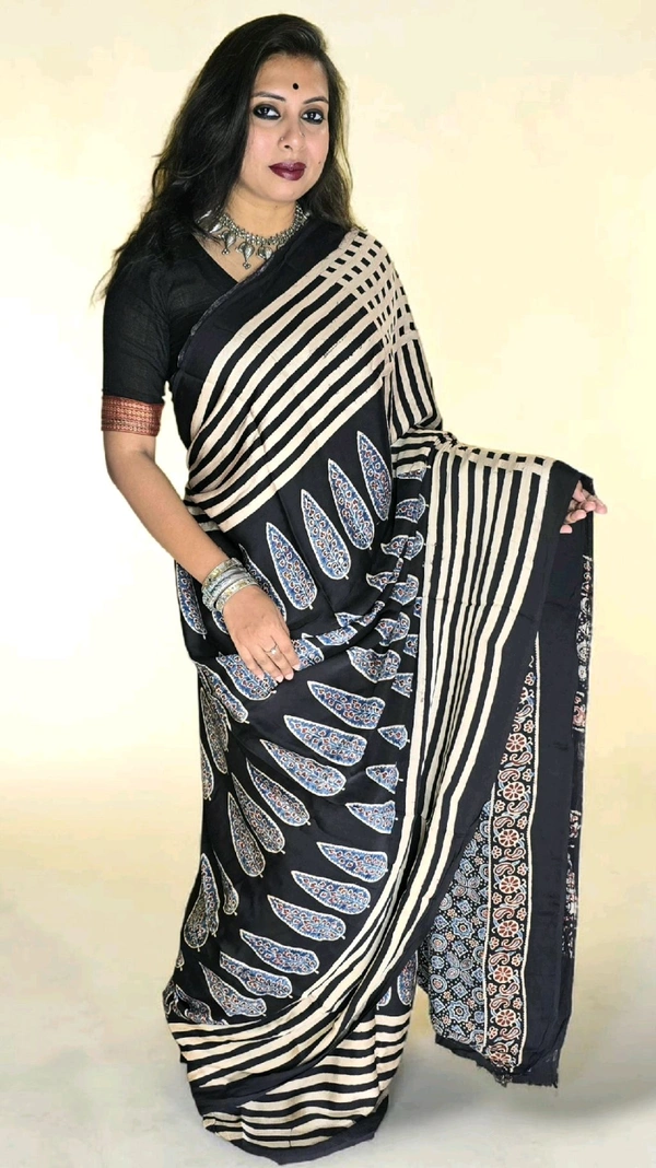 Made with luxurious modal fabric, this saree drapes effortlessly, offering both comfort and style. The Ajrakh print, a hallmark of traditional Indian textile art, adds depth and cultural significance to the design, making it a true statement piece for any wardrobe.