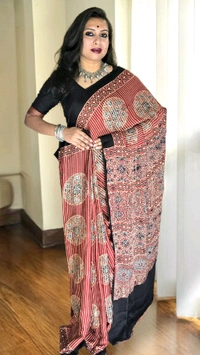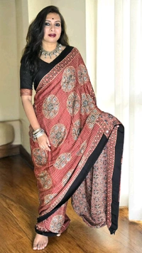 Made with luxurious modal fabric, this saree drapes effortlessly, offering both comfort and style. The Ajrakh print, a hallmark of traditional Indian textile art, adds depth and cultural significance to the design, making it a true statement piece for any wardrobe.