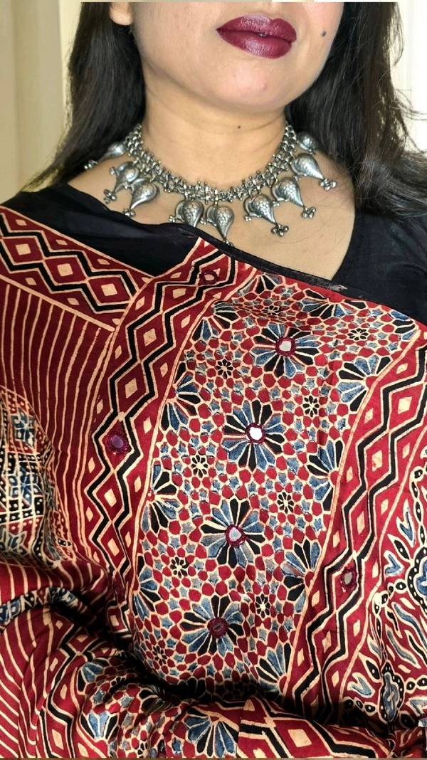 Embrace the timeless beauty of handcrafted artistry with the Mirror Ajrakh Modal Saree from Aparajita FashioNation. Designed for discerning buyers who appreciate tradition and craftsmanship, this saree is a masterpiece that combines impeccable detailing with premium fabric. Whether you're attending a festive celebration, wedding, or cultural event, this saree will ensure you stand out with grace and sophistication.