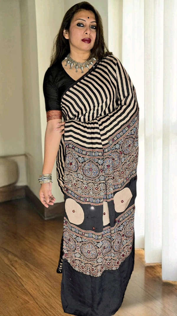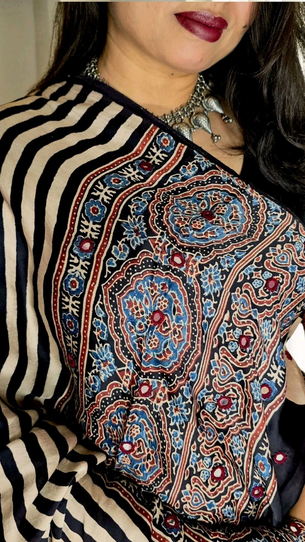 Mirror Ajrakh Modal Saree – A Stunning Blend of Tradition and Elegance