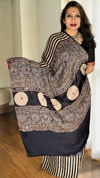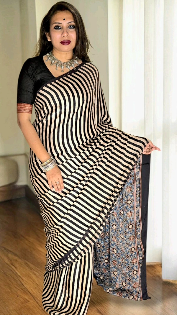 Made with luxurious modal fabric, this saree drapes effortlessly, offering both comfort and style. The Ajrakh print, a hallmark of traditional Indian textile art, adds depth and cultural significance to the design, making it a true statement piece for any wardrobe.