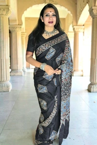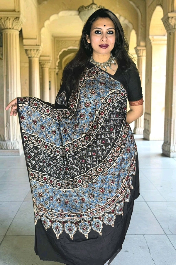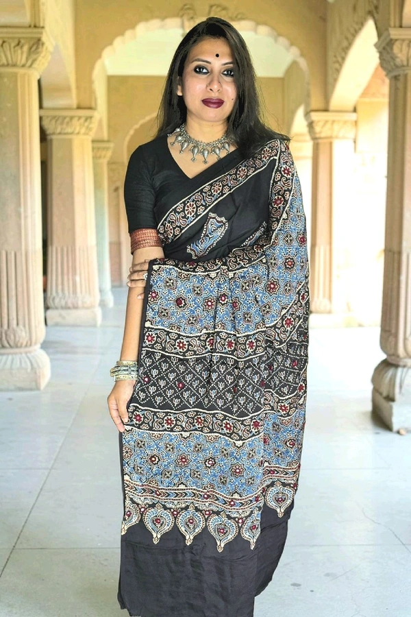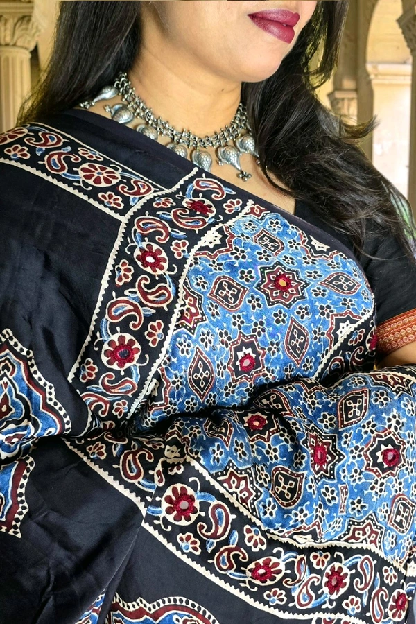 Made with luxurious modal fabric, this saree drapes effortlessly, offering both comfort and style. The Ajrakh print, a hallmark of traditional Indian textile art, adds depth and cultural significance to the design, making it a true statement piece for any wardrobe.