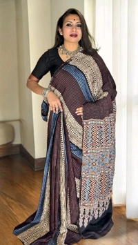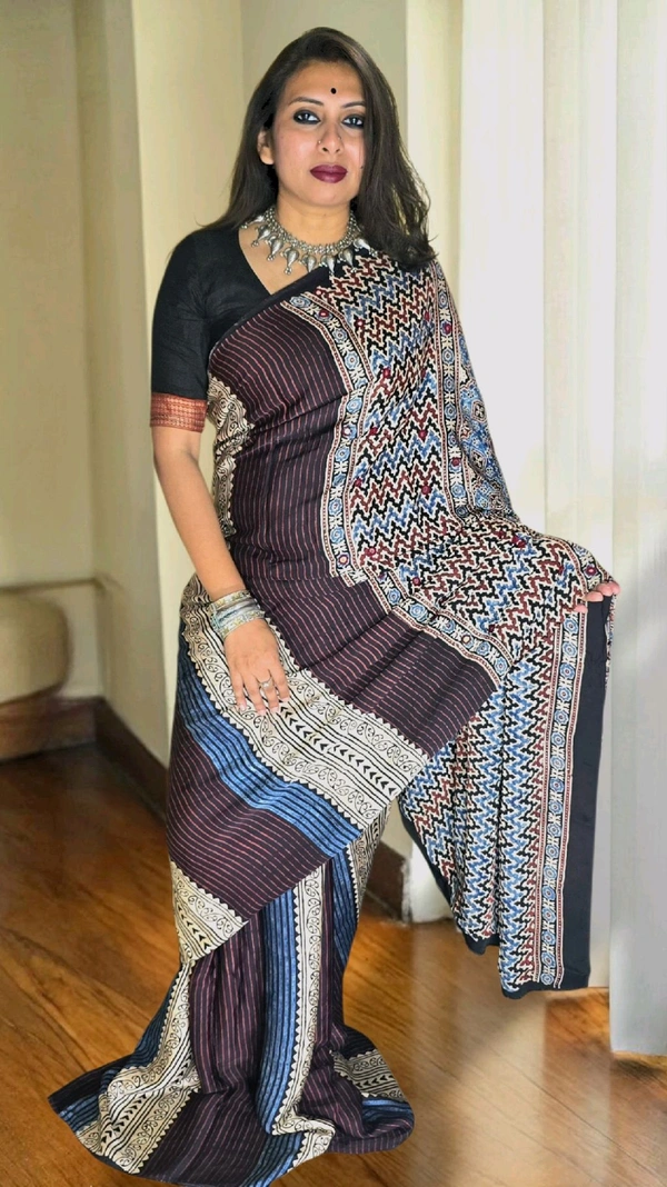 Made with luxurious modal fabric, this saree drapes effortlessly, offering both comfort and style. The Ajrakh print, a hallmark of traditional Indian textile art, adds depth and cultural significance to the design, making it a true statement piece for any wardrobe.