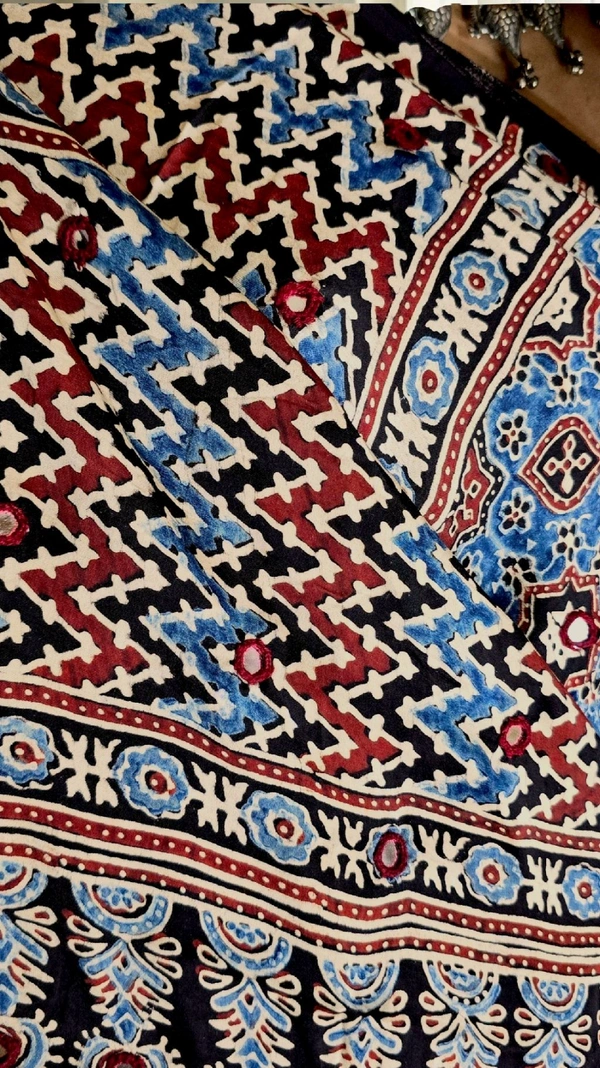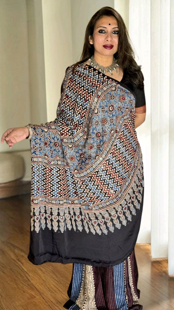 Mirror Ajrakh Modal Saree – A Stunning Blend of Tradition and Elegance