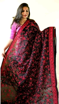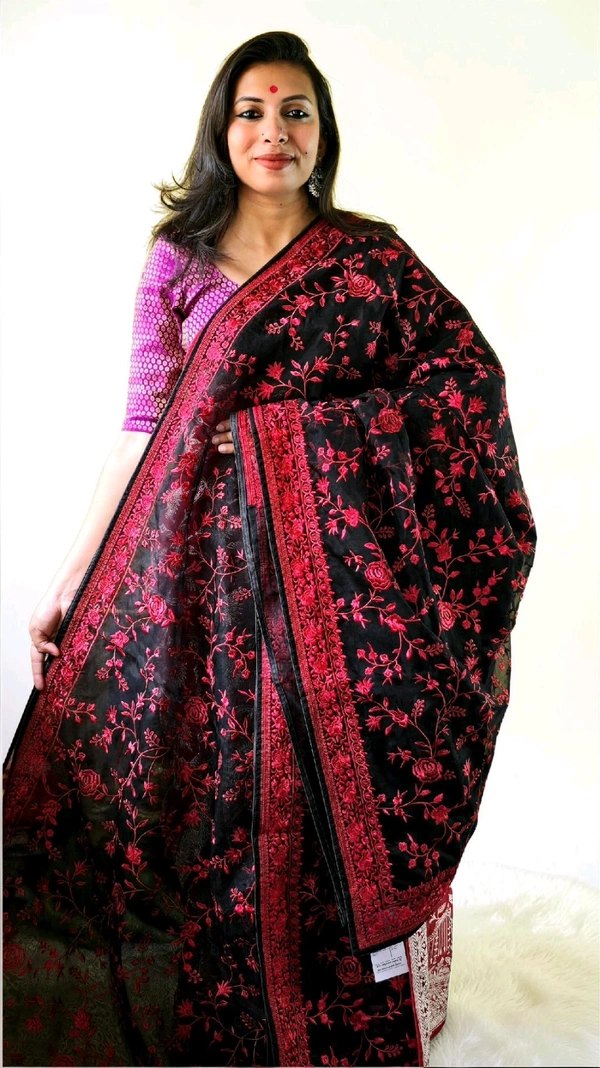 Step into the spotlight with the stunning Organza Black With Red Thread Party Wear Saree by APARAJITA. This masterpiece is designed to make you the center of attention at any event. Its sophisticated combination of bold black organza fabric and intricate red thread detailing creates a timeless look that exudes elegance and charm.