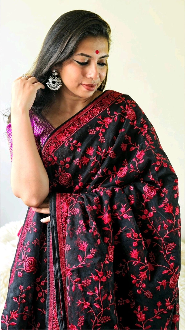 Don’t miss out on this dazzling addition to your wardrobe. Click the button below to order your Organza Black With Red Thread Party Wear Saree now and redefine your fashion statement.