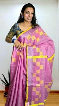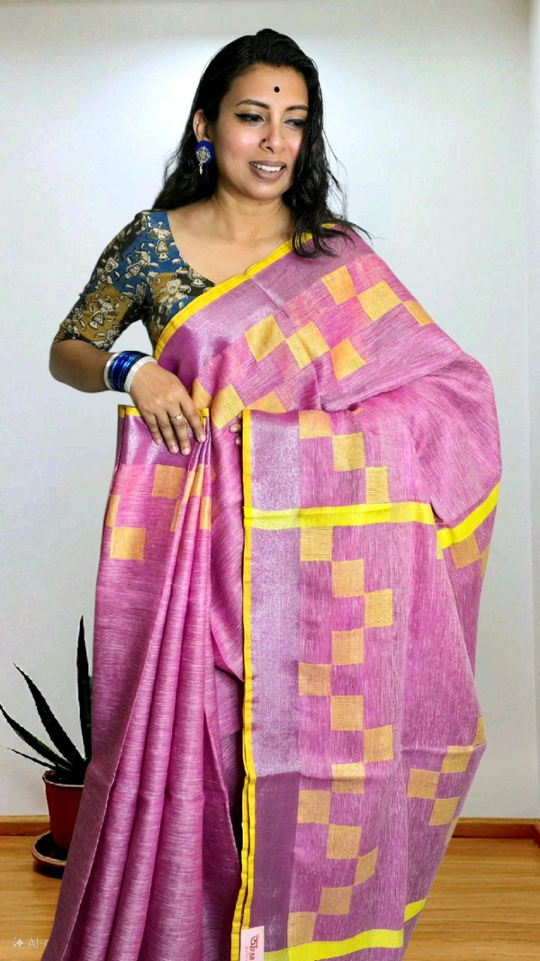 Introducing the Linen Saree by APARAJITA, a timeless piece that combines subtle sophistication with everyday practicality. Featuring a soothing pastel Pink and Blue base accented by charming yellow blocks, this saree is thoughtfully designed to elevate your wardrobe for any occasion.